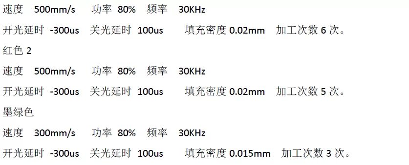 以上參數(shù)可供給激光工藝的人員參考,實(shí)際上因激光參數(shù)和材料的不同,效果可能會(huì)有差別。