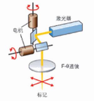 激光打標(biāo)是利用從激光器中輸出的聚焦光束與被標(biāo)記的目標(biāo)物體相互作用,從而在目標(biāo)物體上形成高品質(zhì)的永久性標(biāo)記。圖1給出了典型的激光打標(biāo)機(jī)的原理示意圖。從激光器中輸出的光束,由安裝在高速精密電機(jī)上的兩個反射鏡控制,以實現(xiàn)光束的運(yùn)動打標(biāo)。每個反射鏡都沿著單一的軸線運(yùn)動。電機(jī)的運(yùn)動速度非???,并且慣性非常小,從而能夠?qū)崿F(xiàn)對目標(biāo)物體的快速打標(biāo)。經(jīng)過反射鏡引導(dǎo)的光束利用F-θ透鏡聚焦,焦點位于被標(biāo)記的平面上。當(dāng)該聚焦光束與被標(biāo)記物體相互作用時,物體就被“打上標(biāo)記”了。除了被打標(biāo)的位置,物體的其他表面仍然保持不變。